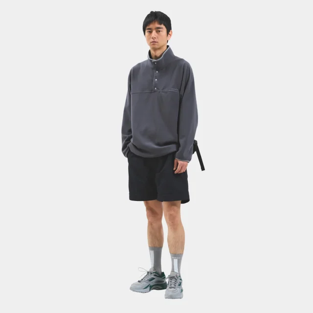 起毛とメッシュという一見相反する機能性を持ったこの生地は、保温性と放湿性を両立させ、アクティブなシーンでの行動着のための素材として開発されている