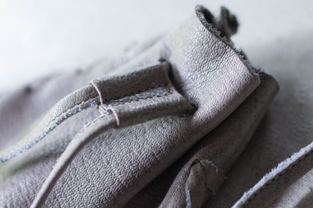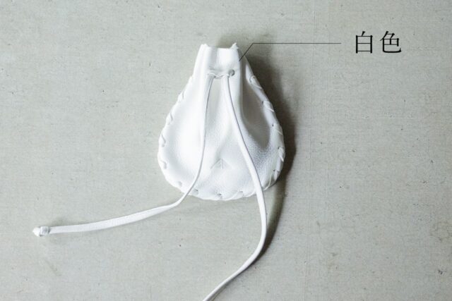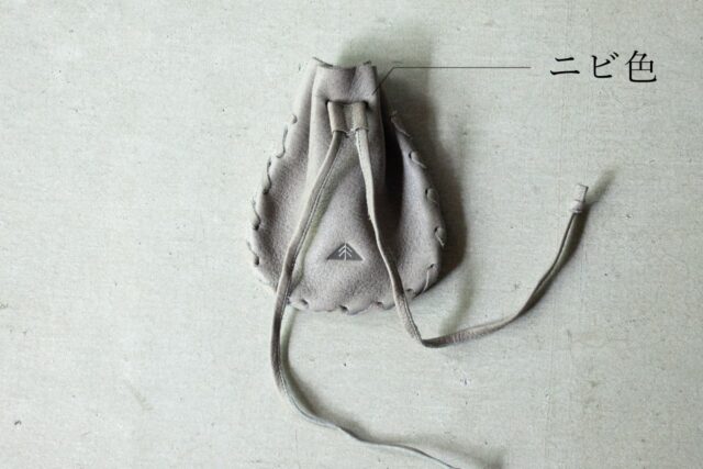 巾着の周囲は、鹿革で作った革紐の飾縫いを手縫いで仕上げています